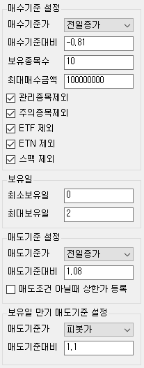 최대보유일: 매수된 종목이 설정된 값 이상으로 보유했다면 만기매도 기준에 매도등록함