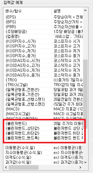 | {볼린저밴드_상단값} | 이동평균({종가},20) + 2 * (종가20일표준편차) |